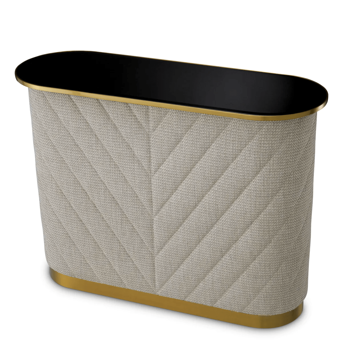 This luxurious piece features the lush Forrester fabric, perfectly complemented by a sophisticated brushed brass finish and sleek black glass top. Its refined elegance and timeless design make it an ideal choice for those seeking unparalleled style in high-end interiors.