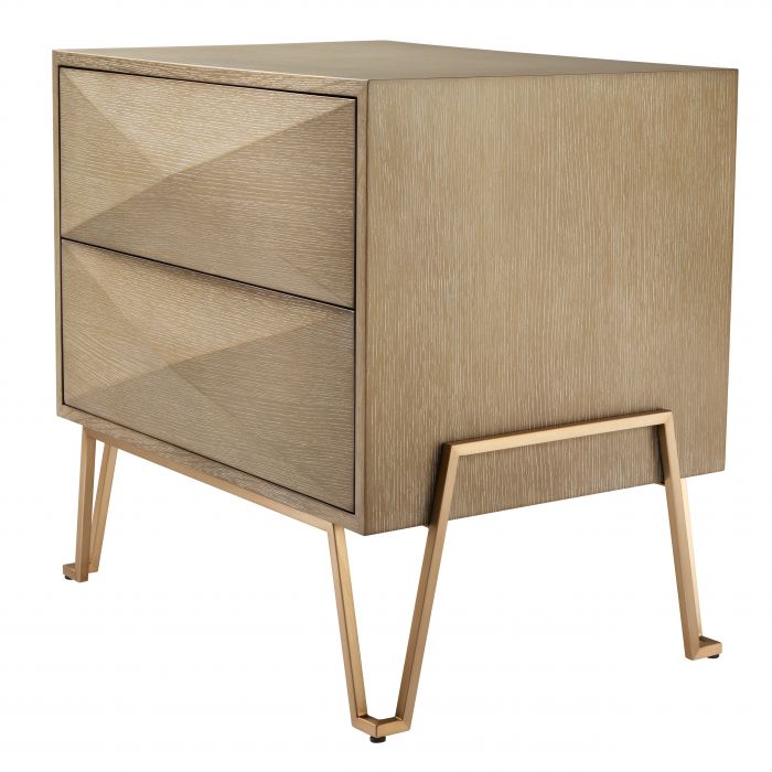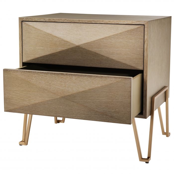 The washed oak veneer Highland Nightstand combines a brushed brass finished frame with washed oak veneer. With their triangular silhouettes, the cabinet doors are real eye-catchers.RETRO DESIGN WITH VINTAGE VENEER LOOKReminiscent of Danish design furniture from the 1950s, the Eichholtz Washed Oak Veneer series grants your home interior a genuine retro look and feel. Combine with vintage style designs from the Eichholtz collection for a complete and harmonious furniture arrangement.POLISHED STAINLESS STEEL WITH CLEAR GLASSThe Eichholtz Washed Oak Veneer series combines brushed brass with washed oak veneer. Subtle contrasting white grains light up the veneer.