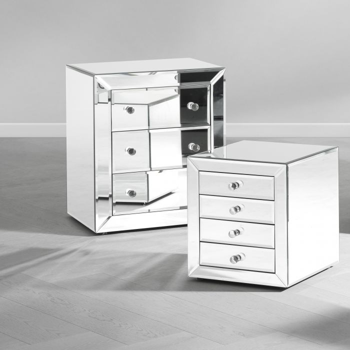 Made from bevelled clear mirror glass, the Reagan Bedside Table features a rectangular frame with straight line detail and four storage drawers.