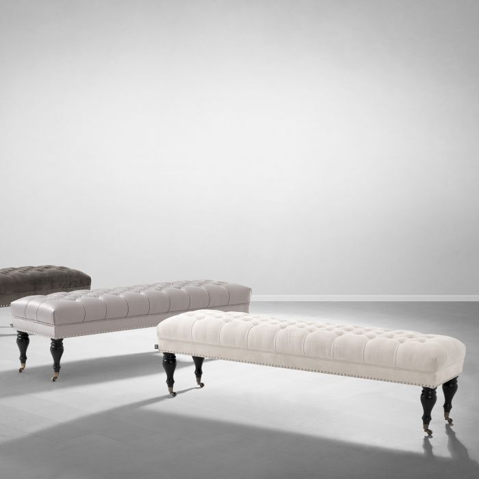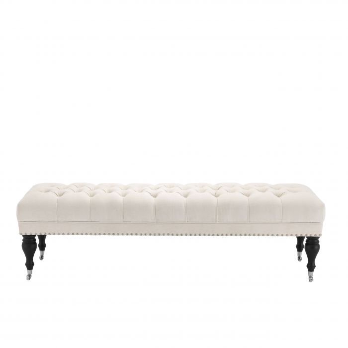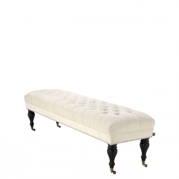 Grace your home interior with the timeless beauty of the Benedict Bench. Featuring a deep buttoned upholstery that breathes the classic chic of Chesterfields, nickel studs, beautiful turned legs and nickel castor wheels, this ecru velvet ottoman elevates your classic décor.