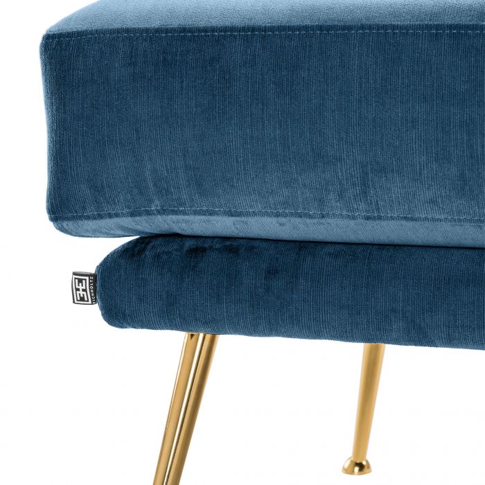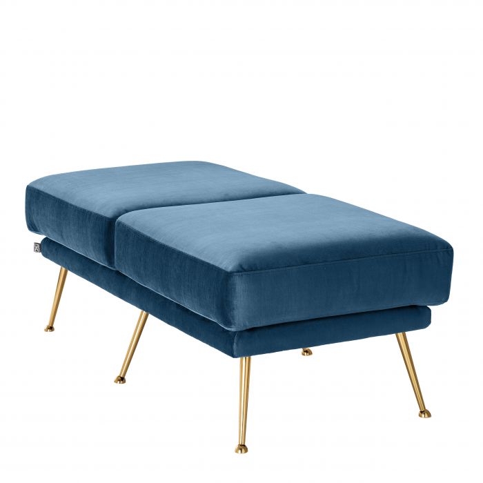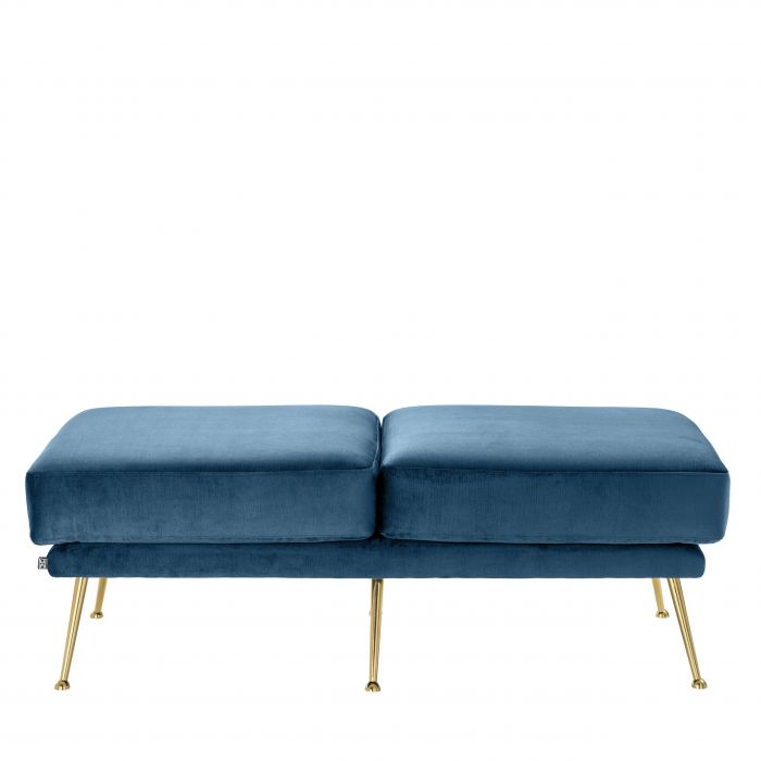 Add the final flourishes to your interior scheme with the Tahoe Bench, featuring a Roche blue velvet upholstery and tapered brass legs. With its chic and sophisticated vintage look, this elegant 2 seater ottoman goes really well in Mid-Century Modern and eclectic décors. A stylish and functional asset for your lounge or the foot of your bed.