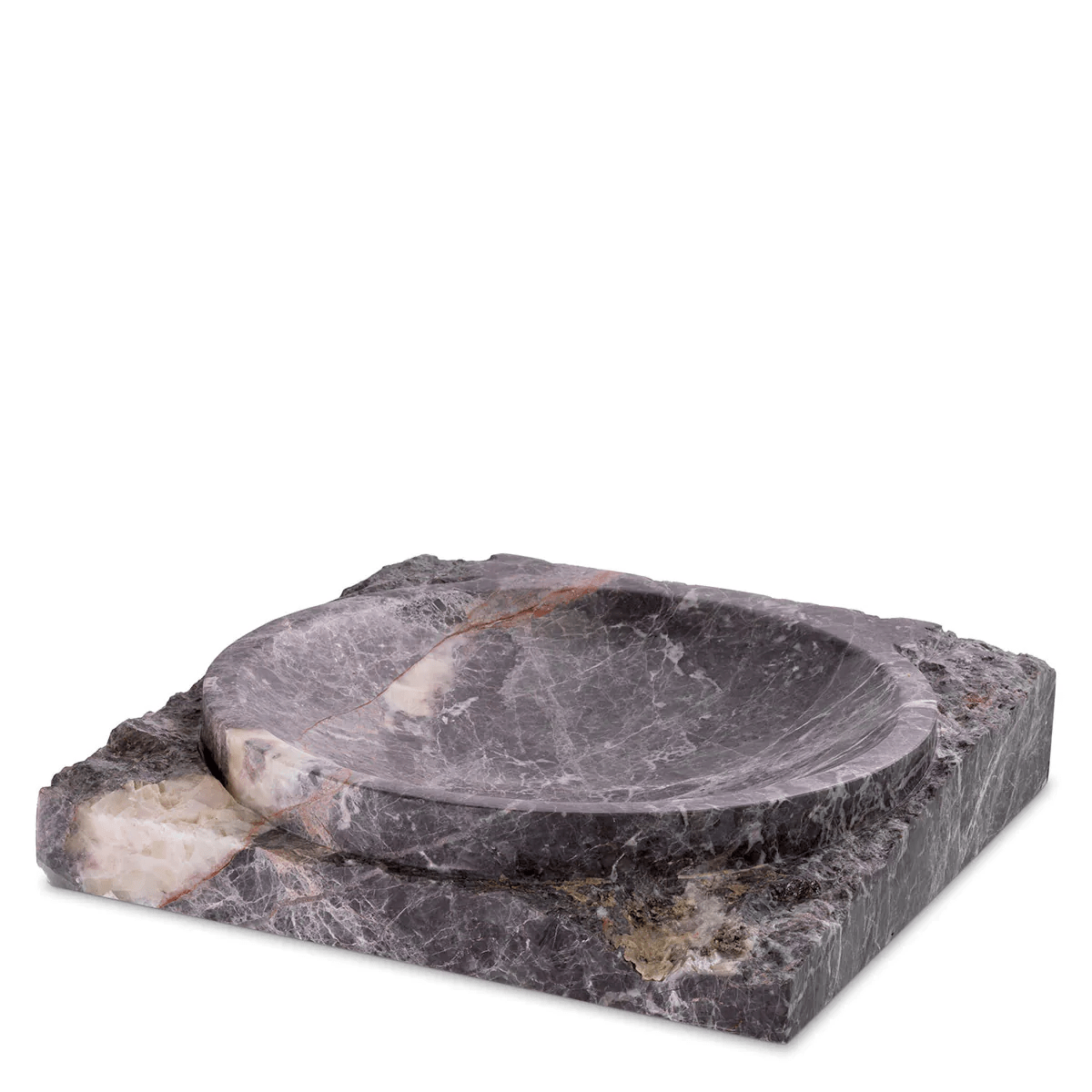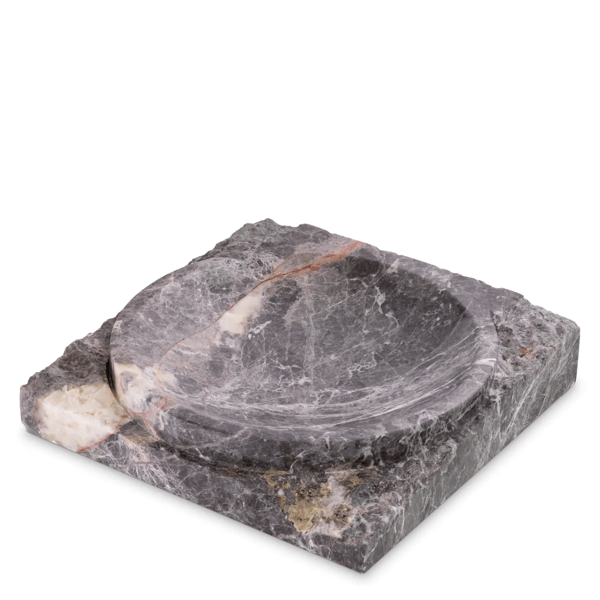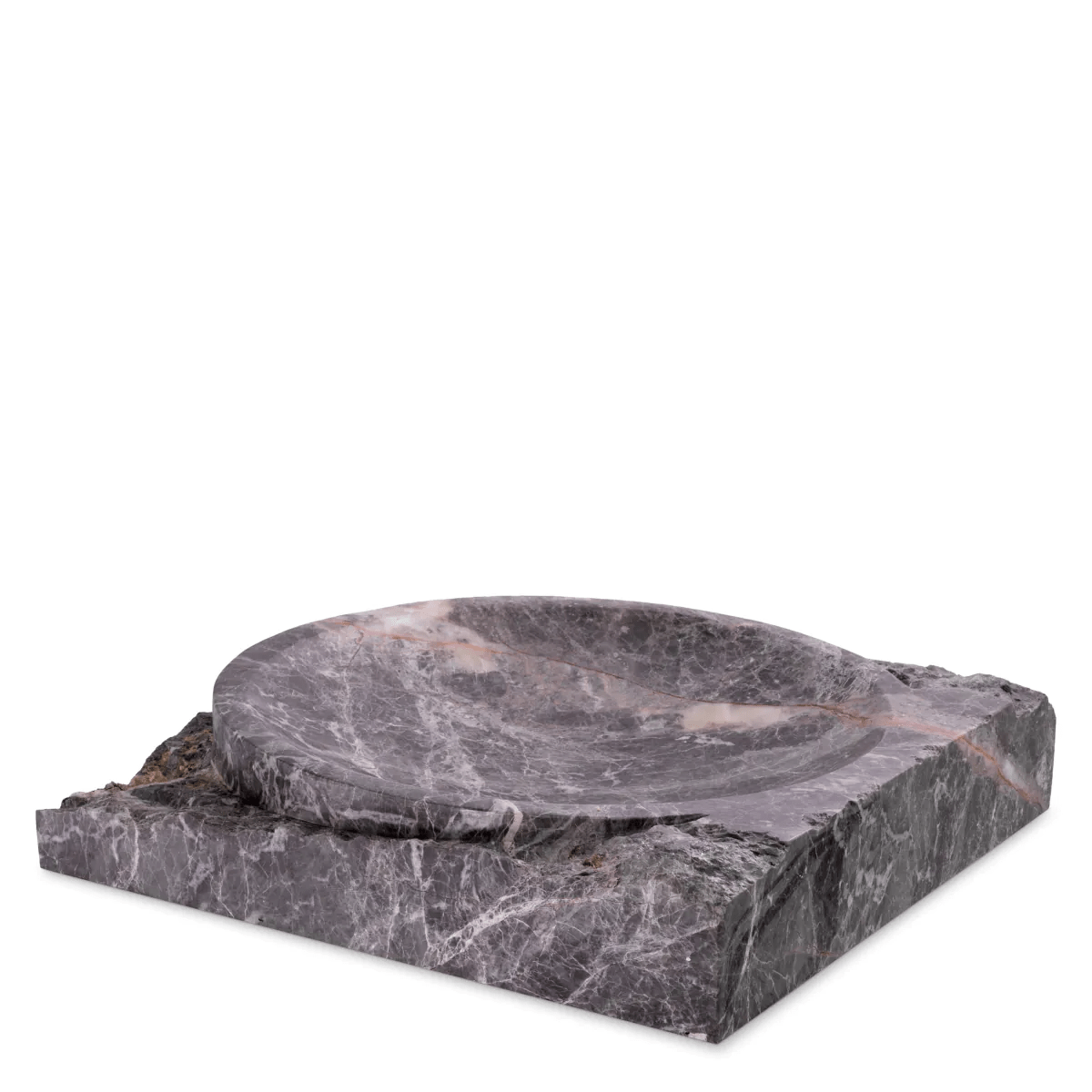 Square in shape, this grey marble piece is characterised by rough sides and a bowl-shaped polished inner.