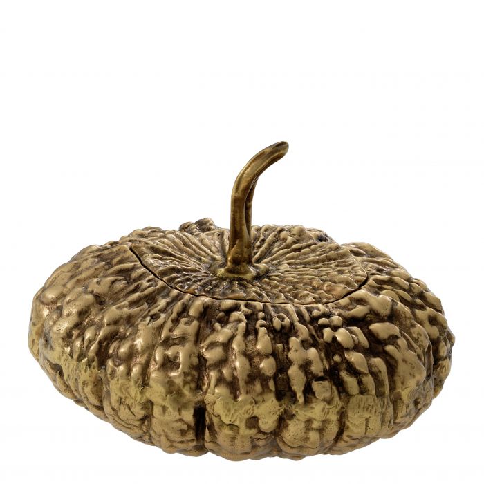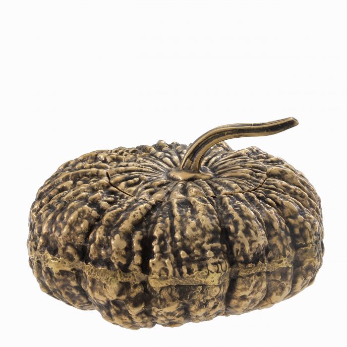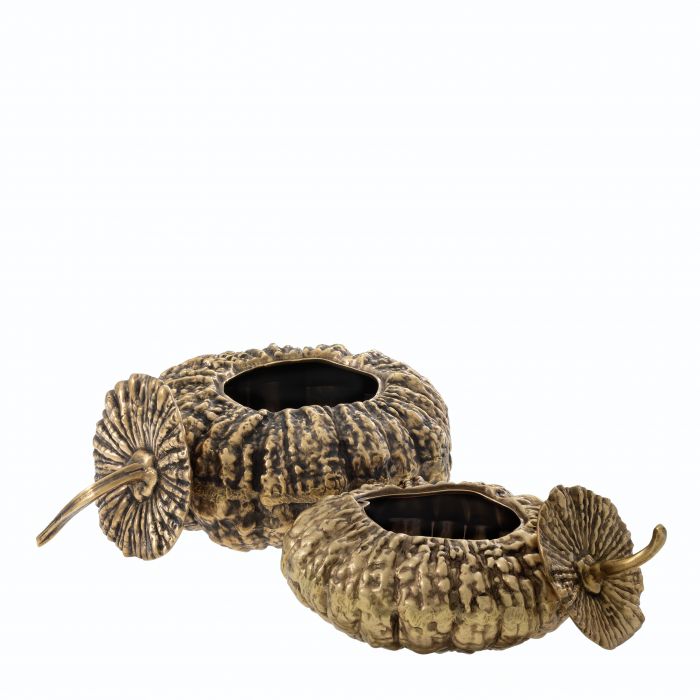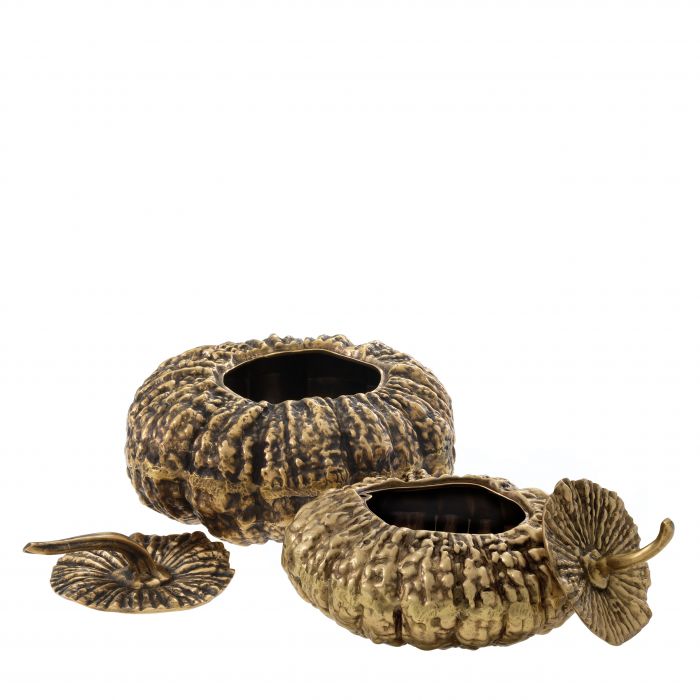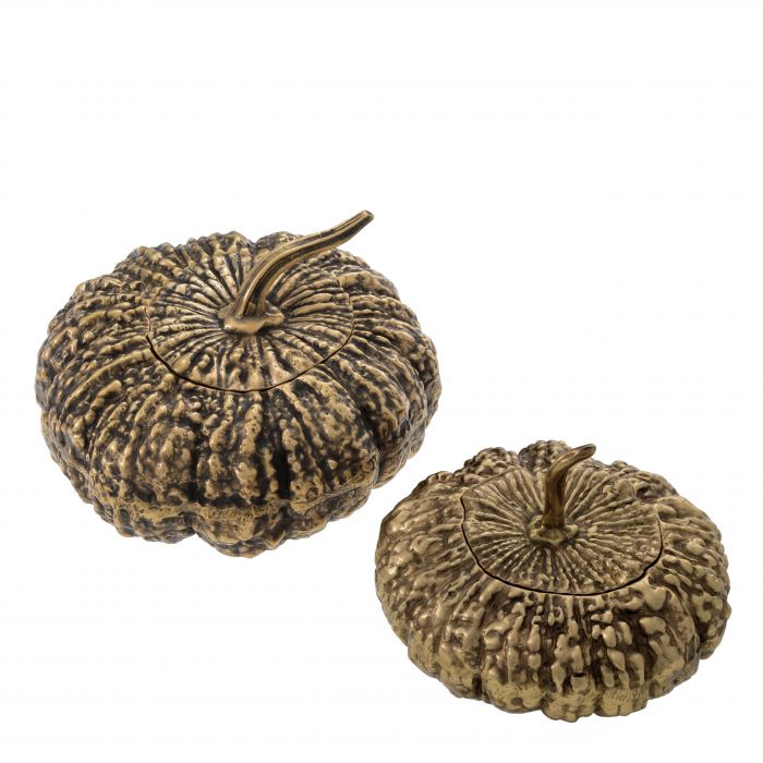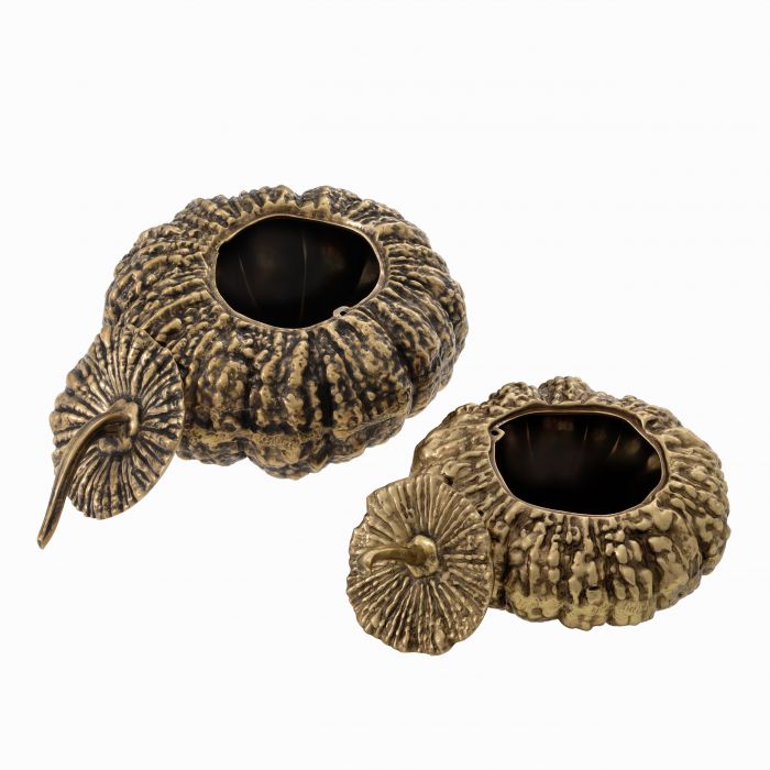 Embellish your interior with this elegant set of 2 Citrouille Boxes. Both pumpkin-shaped canisters have a removable close-fitting top. They feature a gorgeous texture and vintage brass finish. Perfect for display in your kitchen or dining area, these decorative accessories are the finishing touch for your home décor.
