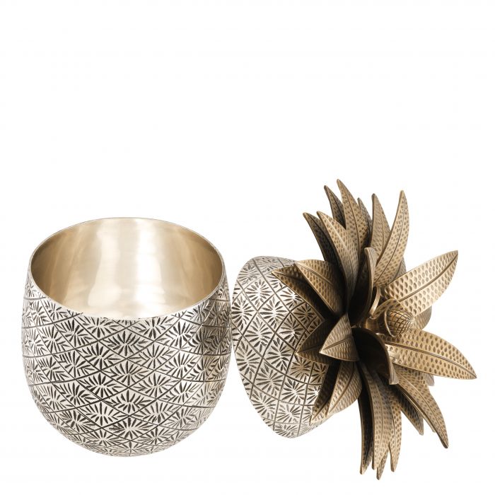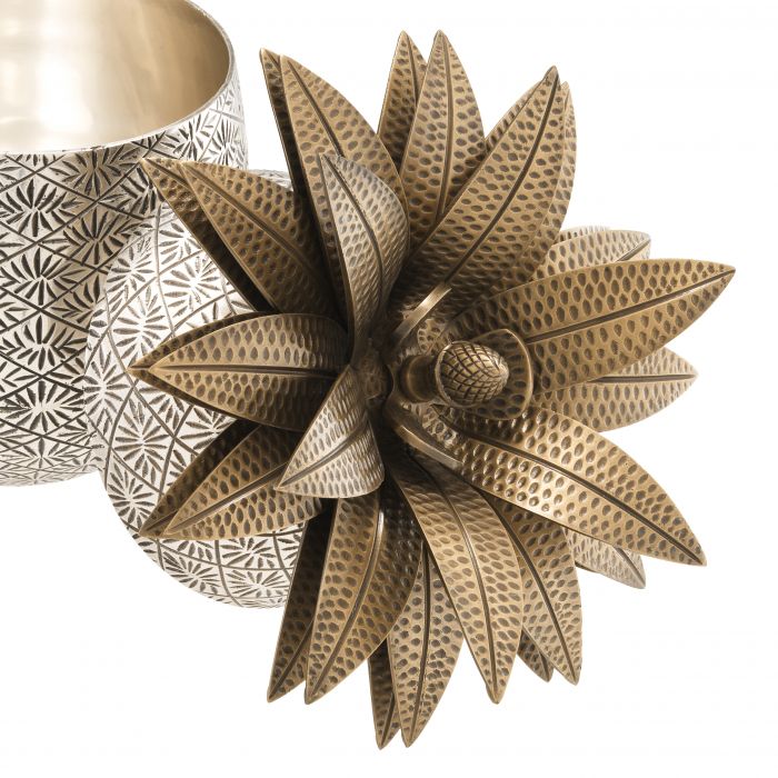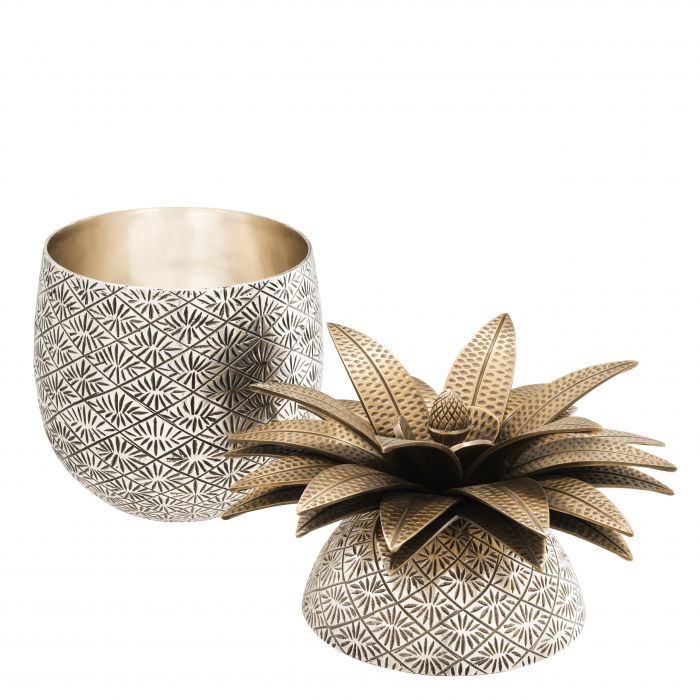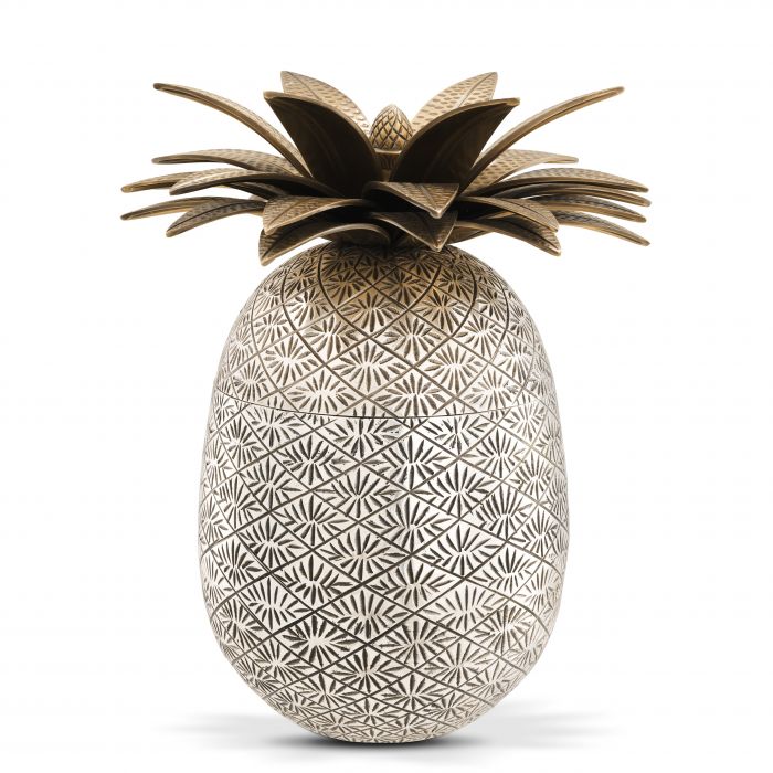 If you love the botanical jungle trend, this lovely Pineapple Box is a must have for you! Featuring an engraved body with antique silver finish and a brass crown, this delightful decorative object and storage box will grant tropical opulence to your interior.