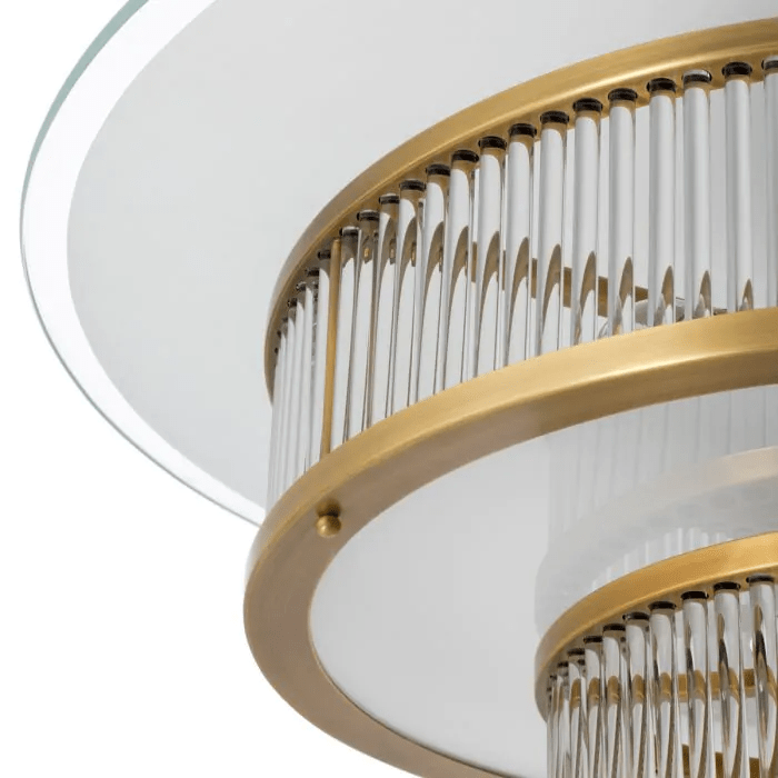 The Frederic exudes an air of regal elegance with its tiered design adorned with clear and white glass elements. Illuminating your space in a harmonious blend of warmth and serenity, the Ceiling Lamp Frederic will grace your decor with an aura of opulence.