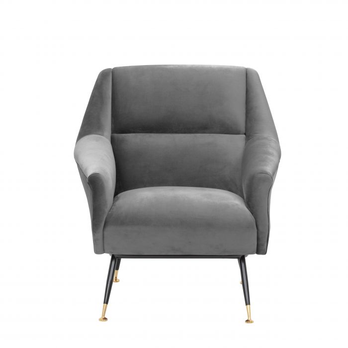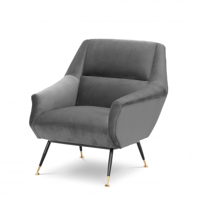 Bring the restrained glamour of the 1950s into your home with the Exile Chair. Featuring an irresistible Mid-Century Modern look that exudes vintage charm, it has a Roche porpoise grey velvet upholstery and black and brass legs.