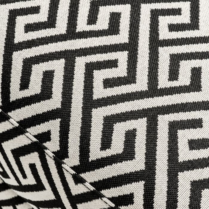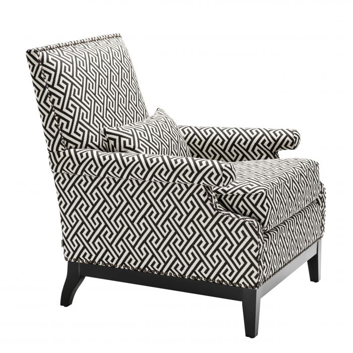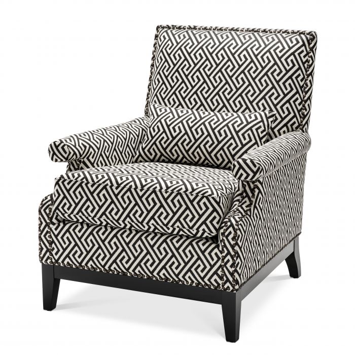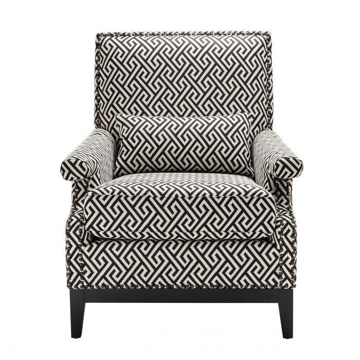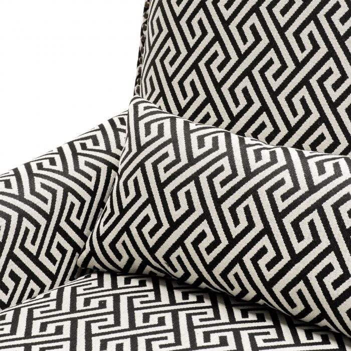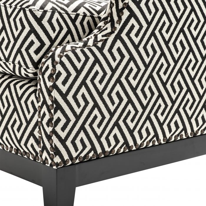 Accent the beauty of your home décor with the Goldoni Chair. A Dudley black upholstery with Greek key pattern gives this luxury armchair a dynamic geometric effect. The elegant proportions of the chair are enhanced with a comfortable cushioned seat pad and a scatter cushion for an unrivalled comfort. Rounded arms with antique bronze stud detailing and a squared seat back with stud trim then completes the aesthetic in style.