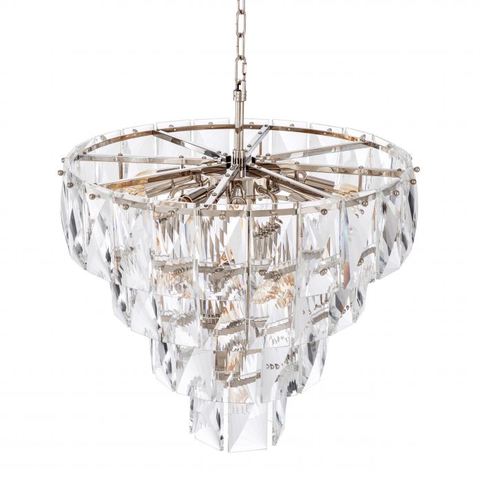 Illuminate your interior stylishly with the glamorous Amazone Chandeliers. Lit or unlit, with its sparkling crystal glass design this lustrous lamp will light up any space in your home. The rectangular glistening crystals hang from different tiers, capturing and refracting light to create dramatic patterns on surrounding surfaces.