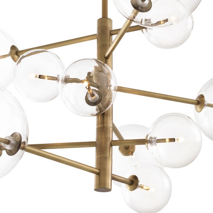 Create a retro-chic focal point in your living space with the Argento S Chandelier. This asymmetrical interpretation of Mid-Century Modern designer lighting instantly elevates your room! It features an antique brass finish and 12 hand blown clear glass globes.