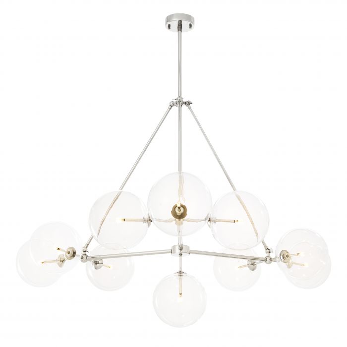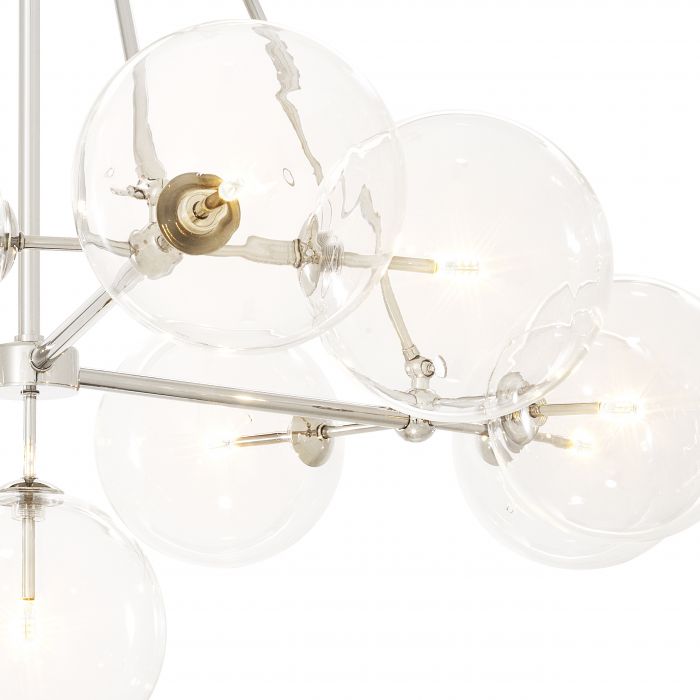 Illuminate your lounge or dining room pleasantly with the Bermude Chandelier. This sleek contemporary luminaire with nickel finish contains 10 clear glass globes that each host their own light bulb.