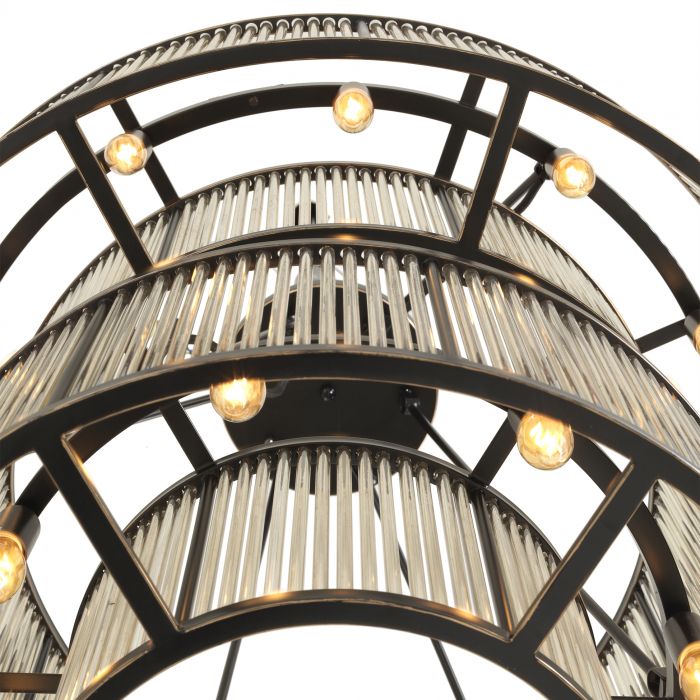 Featuring a pronounced 1920s appeal this enthralling Art Deco inspired Bernardi Chandelier will enliven each space in a sparkling way. With two ascending tiers of sparkling glass shades, each shade is encased in drum-like dark bronze fittings for an elegant contrast.