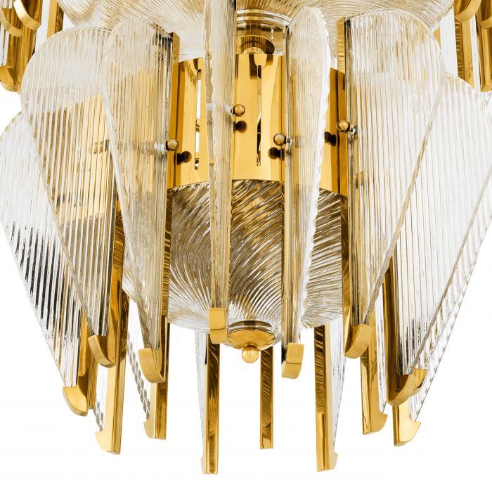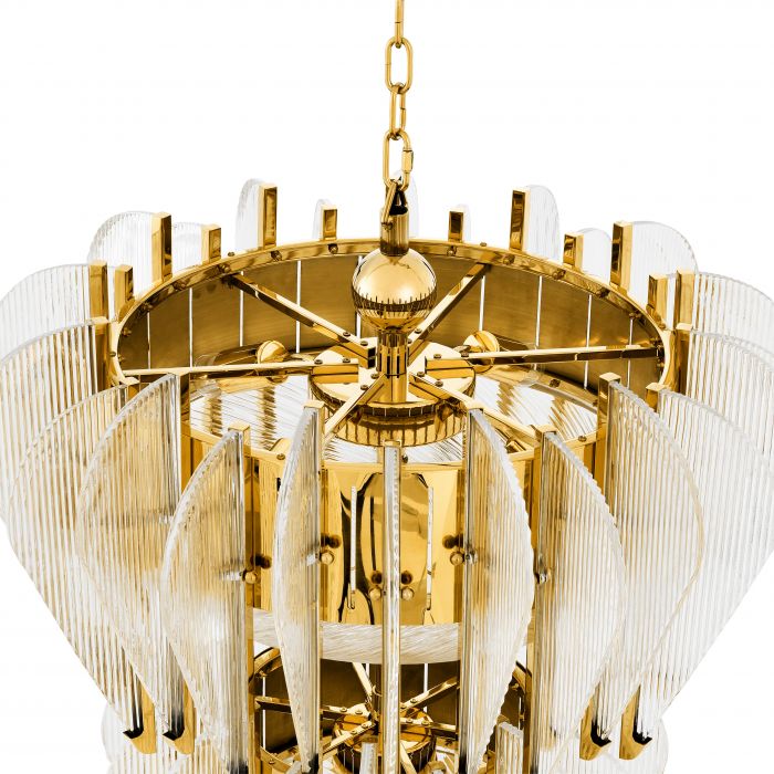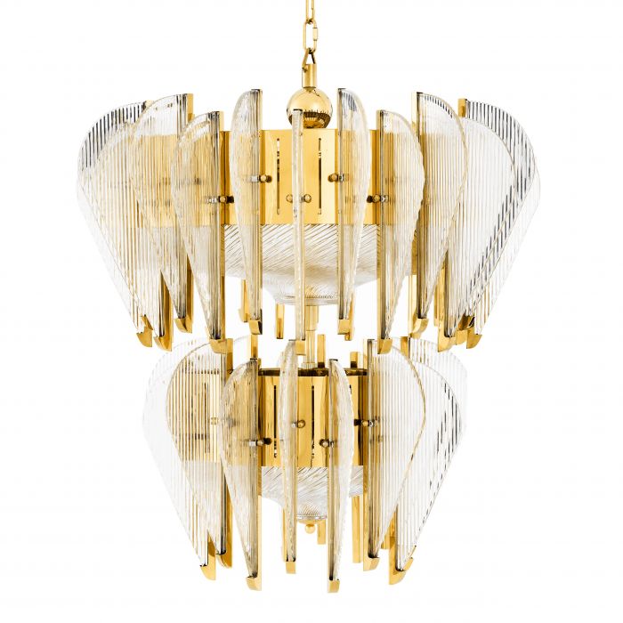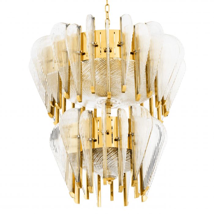 Make a daring style statement in your living room with the glamorous Canzone Chandelier. A modern take on classic lusters, this stunning luminaire is the perfect choice for contemporary interior schemes. Crafted from metal with a gold finish, it showcases a tapered two-tiered design with wing-shaped panels of ribbed glass.