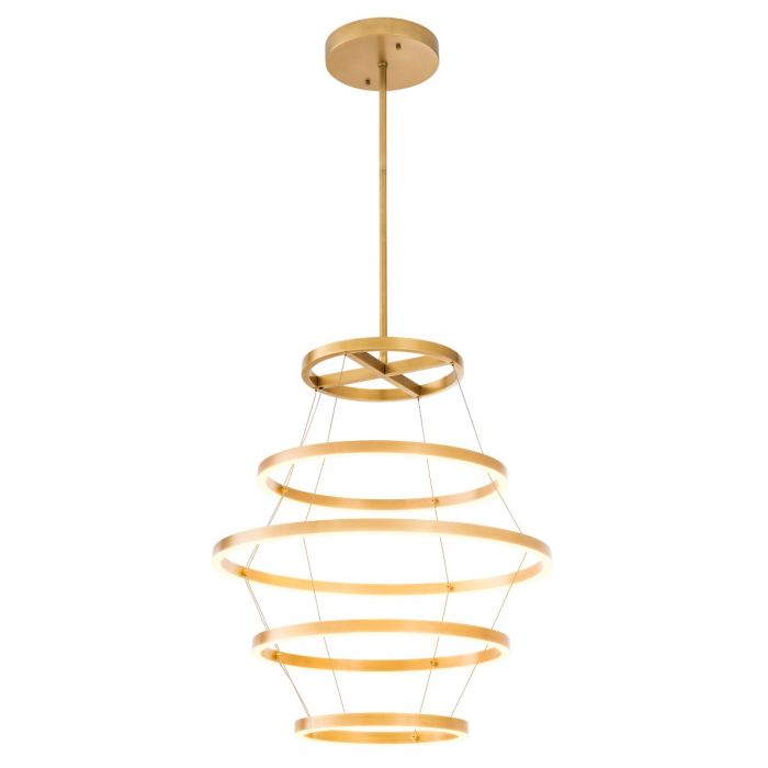 The Elements chandelier looks fabulous in a stairwell or over a coffee table! This lovely ceiling pendant features a state-of-the-art design with a nod to traditional lusters. Comprising a 5-rings fixture with an antique brass finish and integrated LED lights, it will enliven your décor with circles of light.