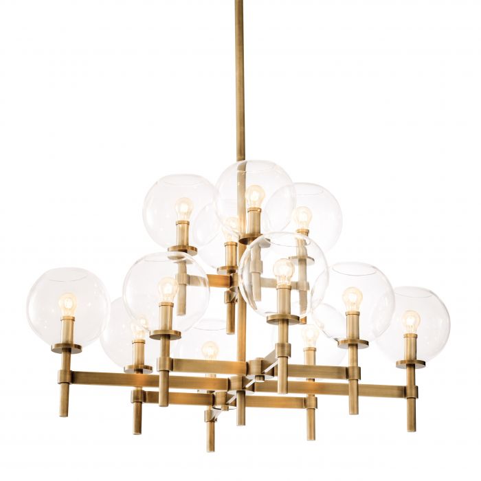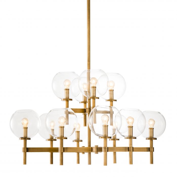 Illuminate your living room interior in contemporary style with the Jade L Chandelier. This lovely two-tiered luminaire has an antique brass finish. From a central stem 12 arms extend in every direction. Clear glass globe shades disperse the light from the bulbs (not included) throughout your space.