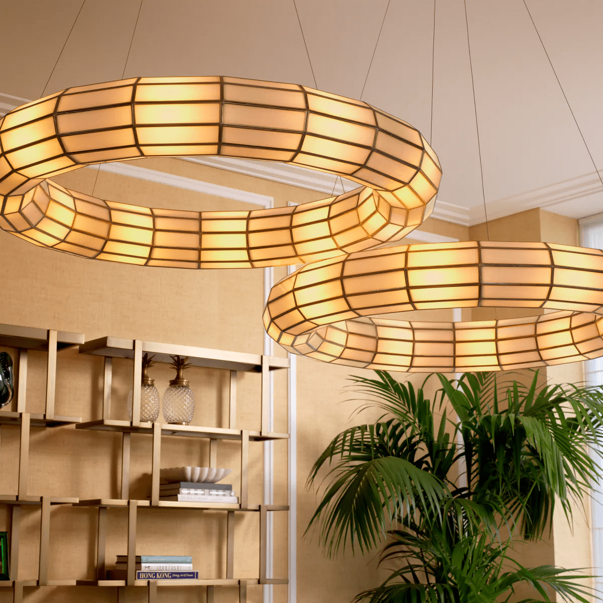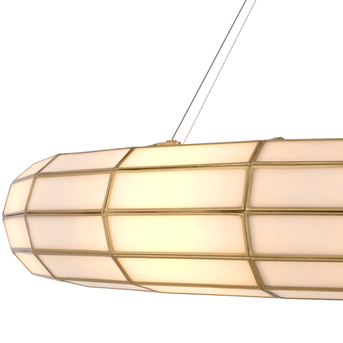 This ceiling lamp’s distinct antique brass finish and handmade glass panels cast a serene ambiance in any space, with an adjustable height to complement Eichholtz’s lifestyle collection seamlessly.