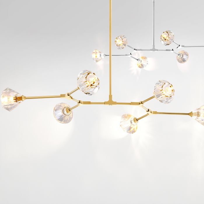 The gold finished Salasco Chandelier features a beautifully branched fixture. Each rod is capped by artisan made crystal glass shades with a diamond cut. Once lit, the integrated LED lights provide beautiful reflections on the ceiling and nearby walls.