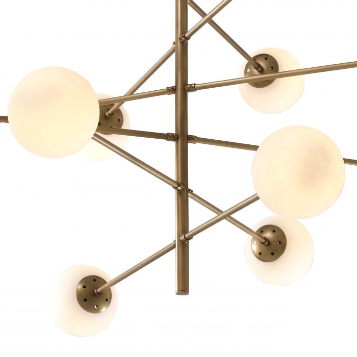 Create a retro-chic focal point in your living space with the Tortora Chandelier. This asymmetrical interpretation of Mid-Century Modern designer lighting instantly elevates your room! It features an antique brass finish and 12 white glass globes.