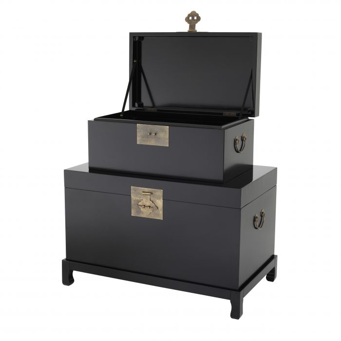Marvellous looks and practical storage make this set of 2 Kani Chests a must-have piece. Because of their simple design these black Chinese trunks will blend in with every interior scheme. Both trunks feature antiqued brass clasps and carrying handles.