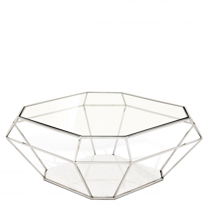 The nickel finished wire frame of the Asscher Coffee Table resembles the outlines of a faceted diamond. It rests on a beautiful white marble base and features a clear glass tabletop.