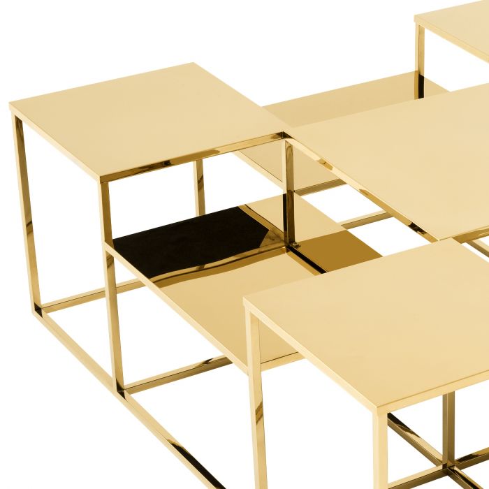The glamorous Avian Coffee Table comprises a solid steel frame with gold finish. Stepped like a podium to create a multi-level configuration, it features eight square glossy tabletops for endless interior possibilities.