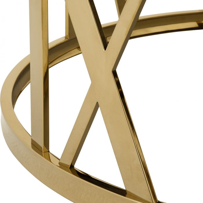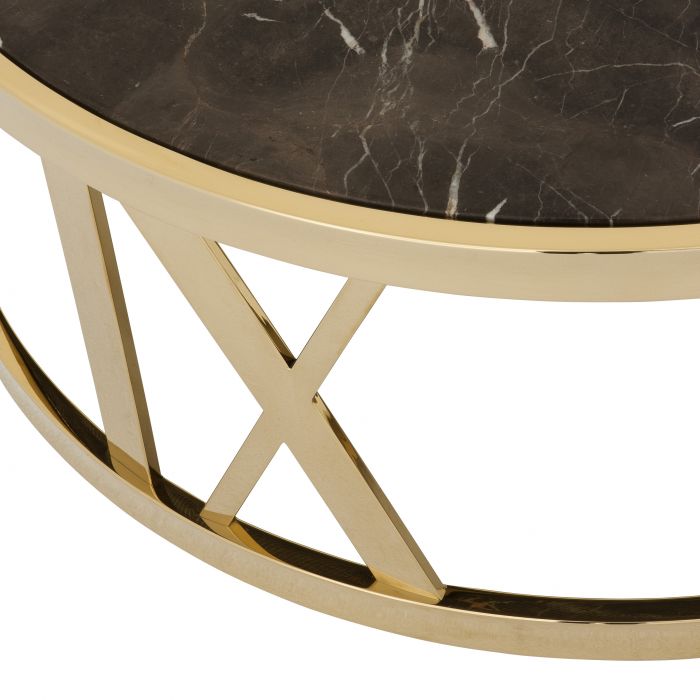 Comprising a gold finished frame with incorporated Roman numerals and a brown marble tabletop, the Baccarat Coffee Table will fit well in any interior whether traditional or modern.