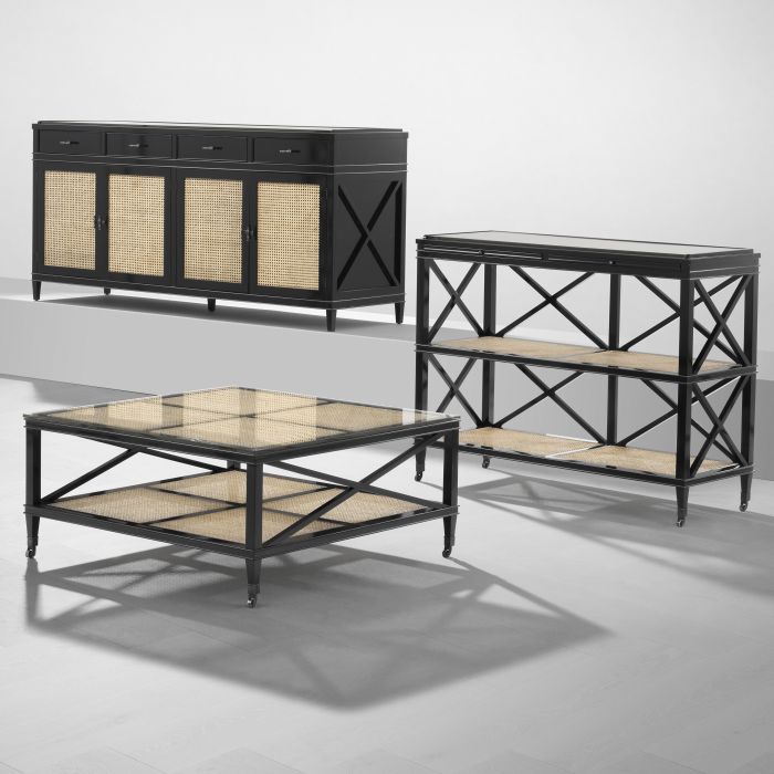 The enchanting Bahamas Coffee Table takes style cues from the romantic charm of British colonial interiors and Caribbean plantation homes. Comprising pine wood, natural mesh cane webbing and clear glass, it features a black finish and cross bars for added design.
