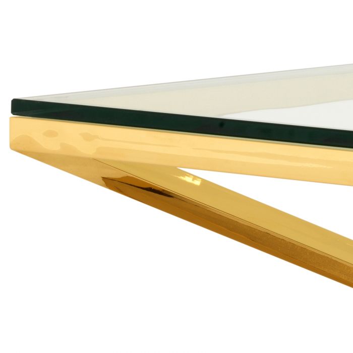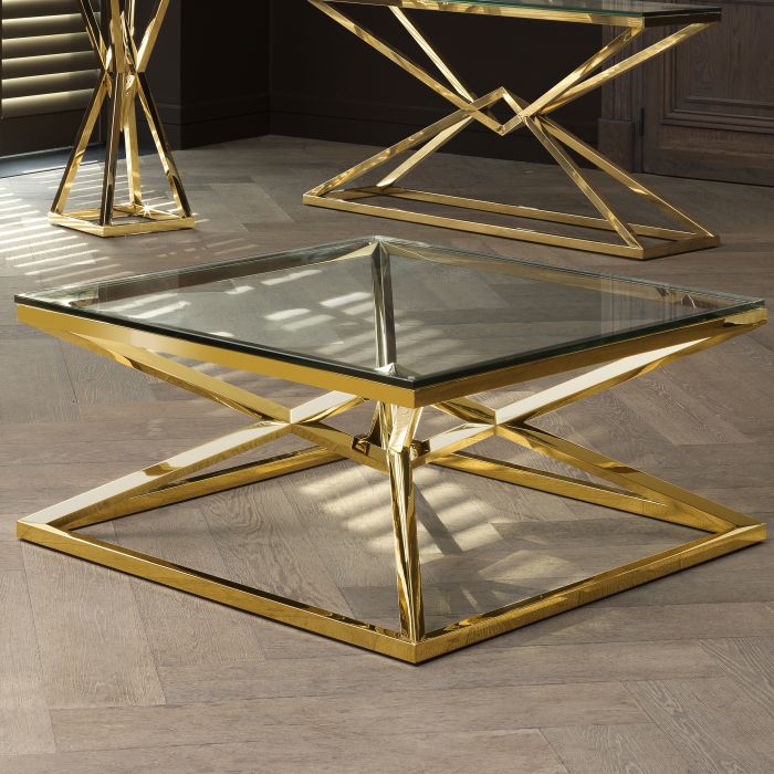 Discover the versatility of the Connor Coffee Table. With its shiny pyramid base, this designer table adds radiance and splendour to your home décor. Crafted from stainless steel, the conspicuous geometric base features a glamorous gold finish and a clear glass tabletop.