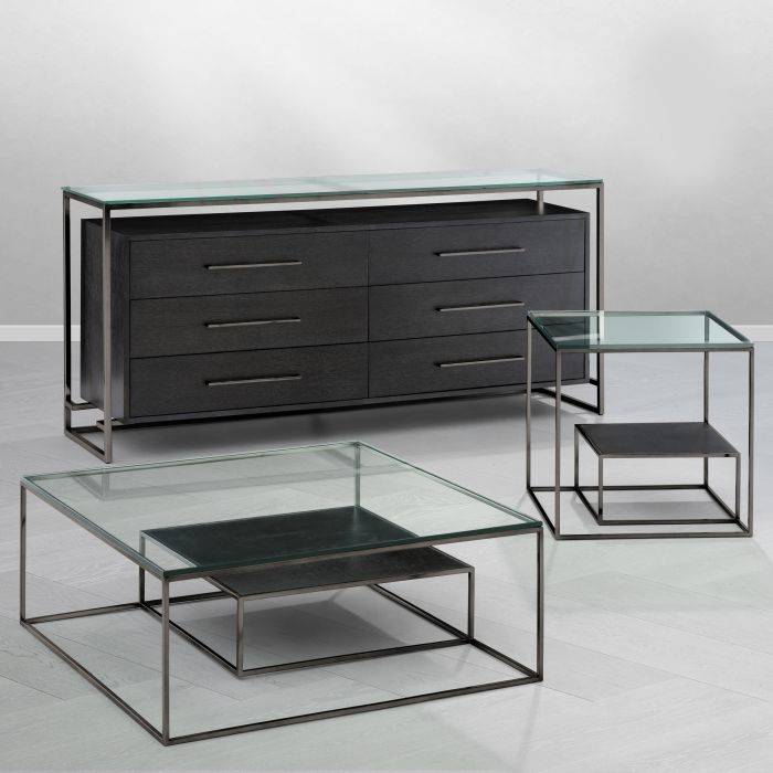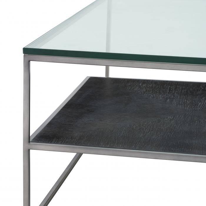Inspired by the minimalist silhouettes of Bauhaus design, the Durand Coffee Table exudes timeless appeal. This multi-layered furniture piece features a clear glass tabletop and a lower shelf of charcoal oak veneer.