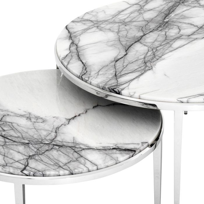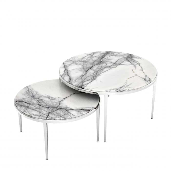 Add timeless style to your lounge or living room with this alluring set of 2 Fredo Coffee Tables: a great addition for both classic and contemporary interiors. They feature a nickel finished frame with four tapered legs and a white marble tabletop with black veins.