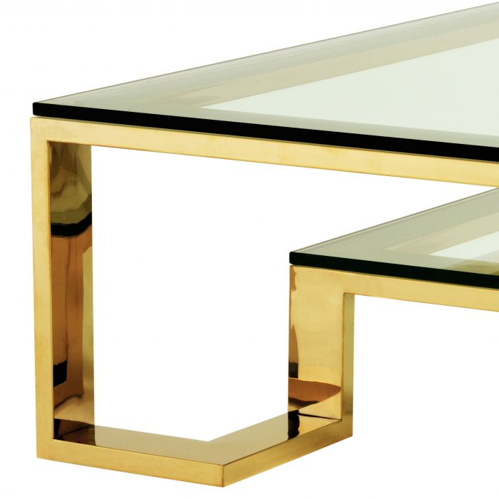 Transform your interior with the Huntington Coffee Table. With its clean line design, this rectangular gold finished designer coffee table features a clear glass tabletop and a lower shelf that provides space for decorative home accessories.