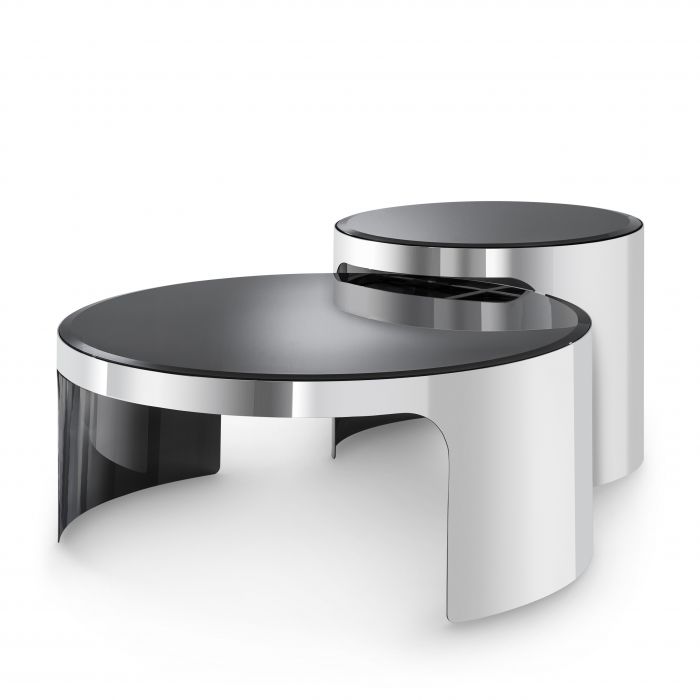 Enhance your relaxation area with the set of 2 Piemonte Coffee Tables. The retro look and elegant curves of these two nesting tables are perfectly complementary. With a mirrored tabletop of bevelled black glass and a base of polished stainless steel, they will make a chic addition to your living room décor.