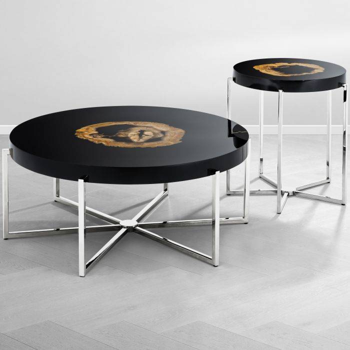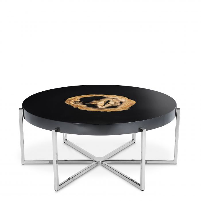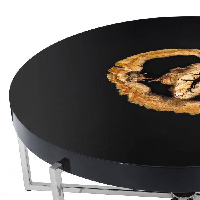Invite the natural beauty of the Pompidou Coffee Table into your home. This gorgeous nickel finished coffee table nestles a petrified wood insert inside its black high gloss tabletop. The wonderful contrast of materials turns these discerning furniture pieces into instant focal points.