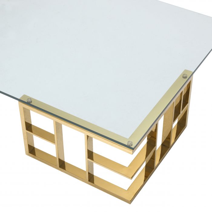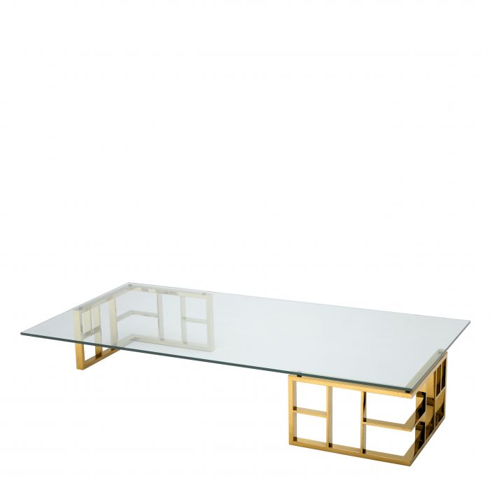 Bauhaus appeal and oriental style converge in this exceptional design of the stunning Ramage Coffee Table. The two angular trellis base elements are presented in a gold finish. The clear glass tabletop makes their beauty stand out. A great asset for transitional and eclectic décors.