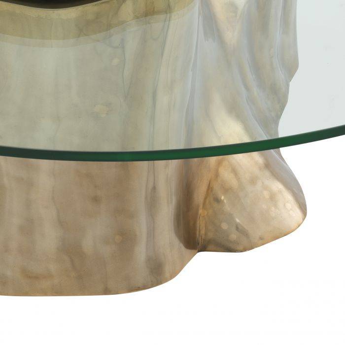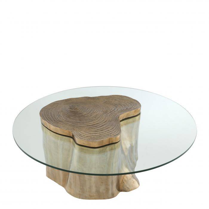 The structure of wood grain grants a unique appearance to the Urban Coffee Table. Featuring a solid base of wood with a bronze finish and a round clear glass table top, this distinctive coffee table is suitable for a variety of interior styles and colour schemes.