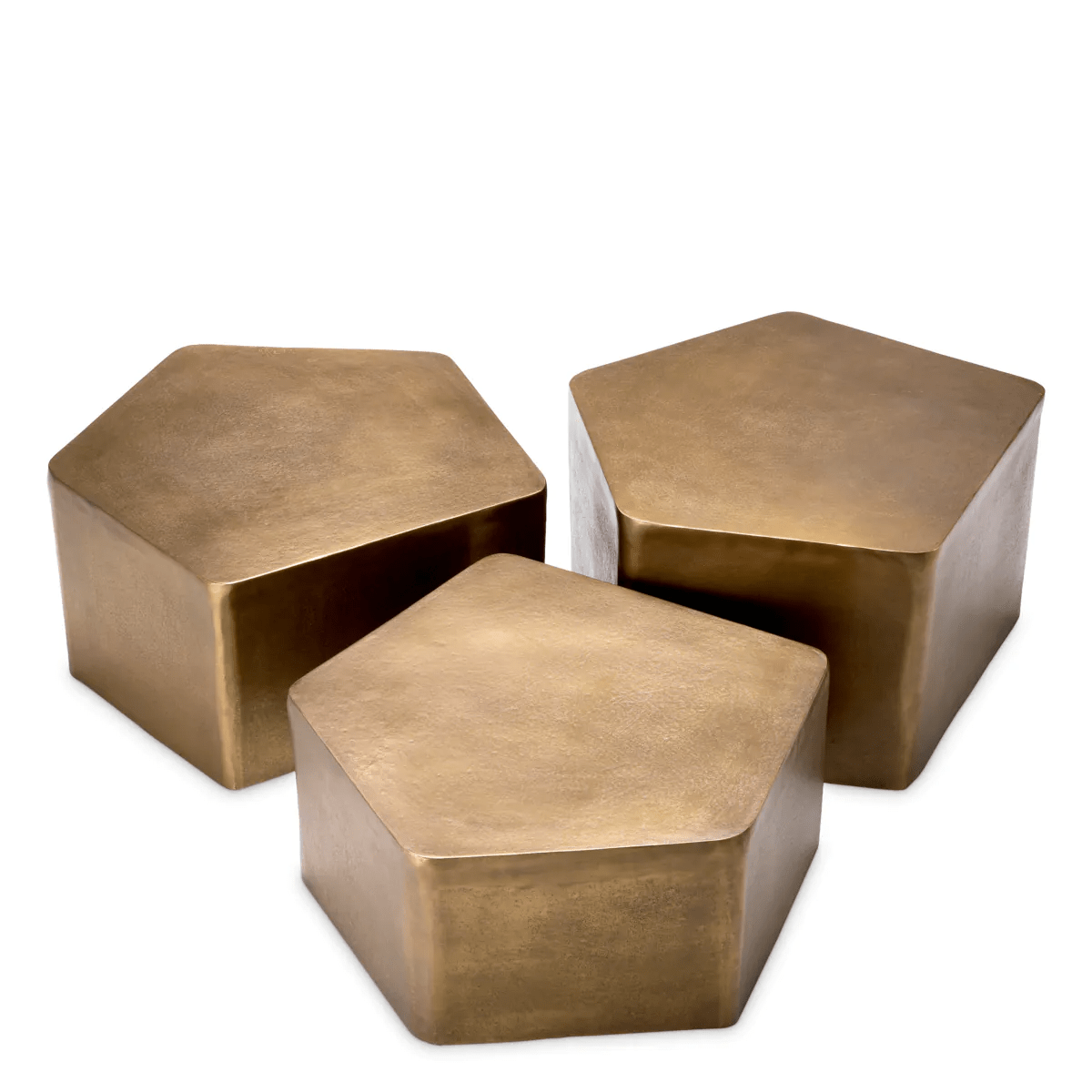 A tribute to artisan craftsmanship, these three pieces boast a vintage brass finish for an antiqued look that harmonizes with an array of décors. Designed to be placed playfully, their organic shape and exclusive metal construction reflect Eichholtz’s commitment to luxurious, timeless furniture