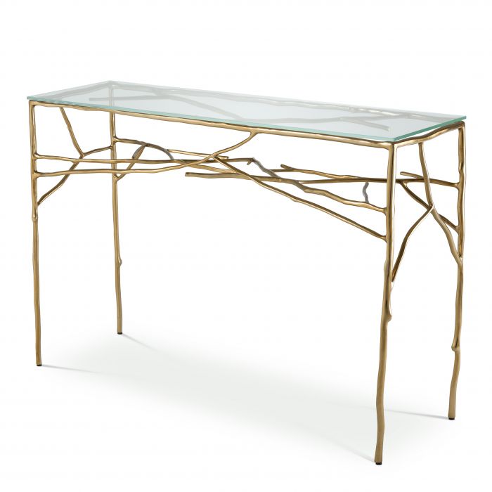 Add a sense of statement appeal to your living space with the Antico Console Table. Featuring a superb branch-like frame with a gold finish and a clear glass top, this console is great for showcasing everything from picture frames to flower arrangements.
