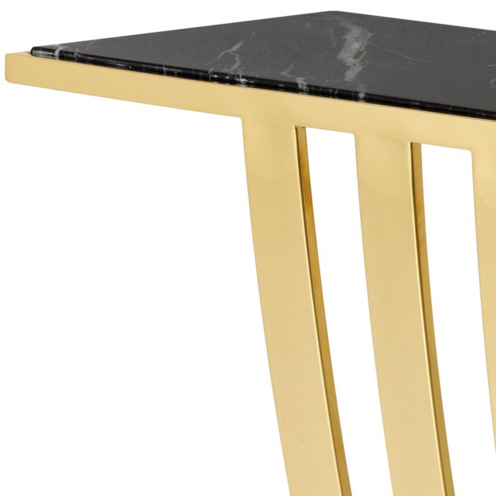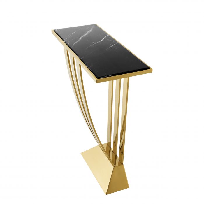 Create a monochromatic effect in your interior with the Beau Deco Console Table. It comprises a unique gold finished frame with a large, sturdy base and protruding slats on either side. The rectangular tabletop has a black marble surface.