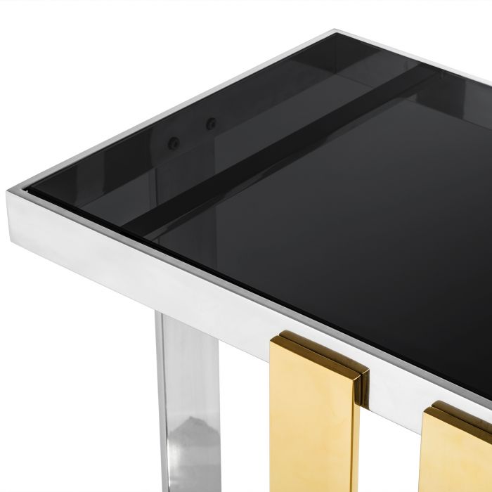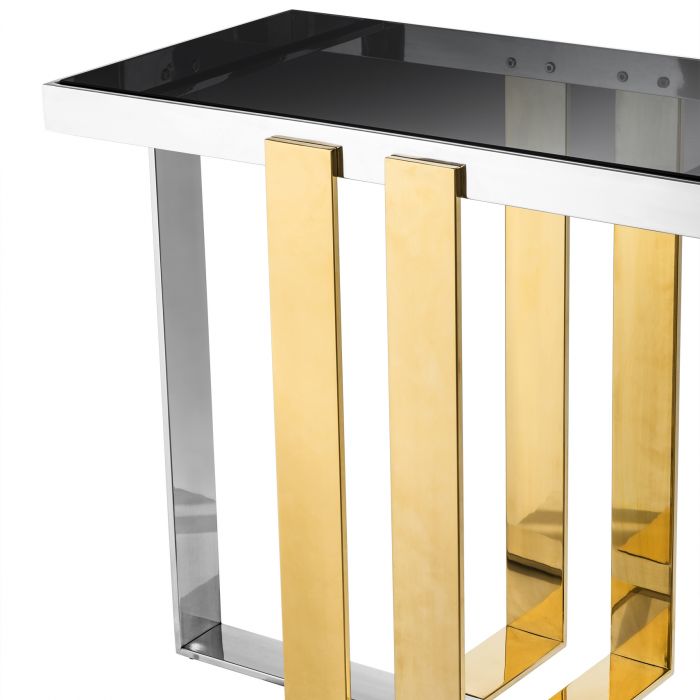 Inspired by the pure vertical and horizontal lines of Dutch art movement De Stijl, the Belgo Console Table comprises a polished stainless steel frame with two gold finished table legs and a smoke tabletop.