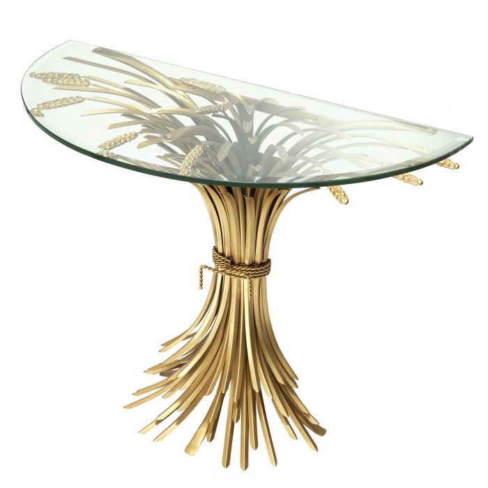 Sculpted from iron in an antique gold finish, the dazzling Bonheur Console Table includes a sheaf-shaped base and a bevelled clear glass tabletop. Originally a symbol of prosperity and hospitality, the sheaf signifies one has worked hard and is now enjoying the good life.