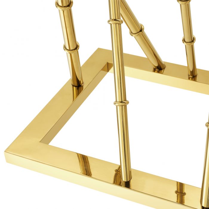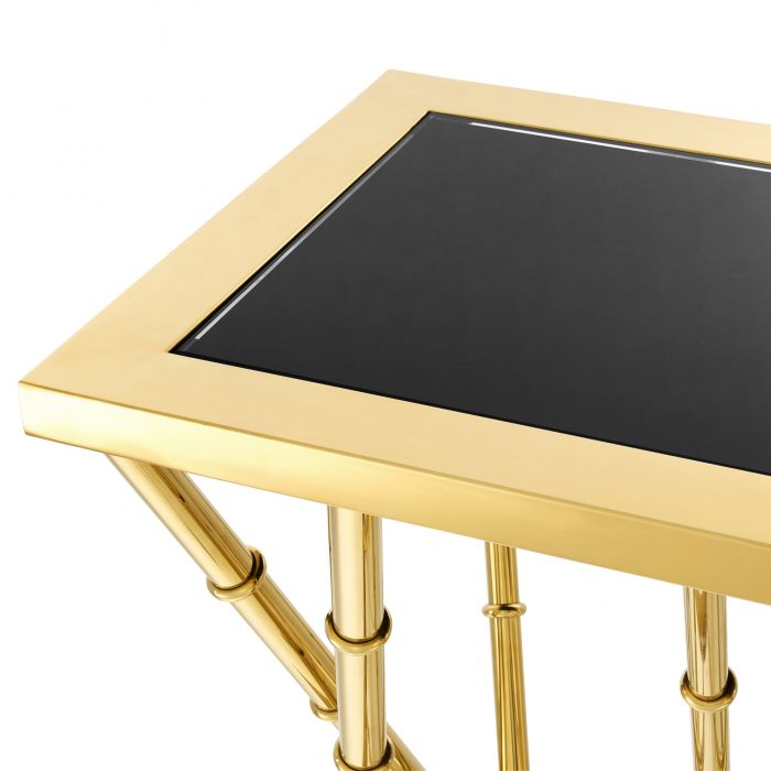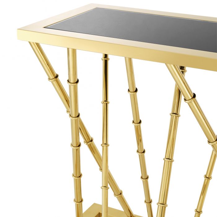 Add a touch of restrained glamour to your home decor with the Cristiano Console Table. Inspired by oriental boutique hotels, this luxury console table features an intriguing bamboo-like frame with gold finish and a black glass tabletop.
