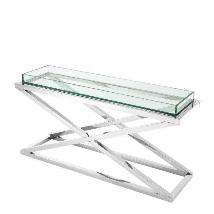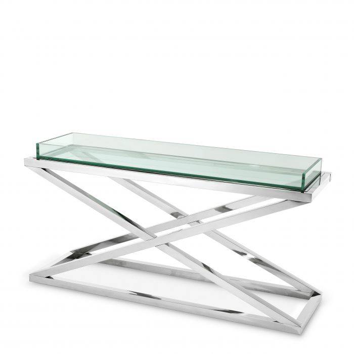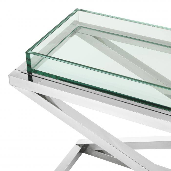 Add a sleek and modern touch to your lounge interior, bedroom or hallway, with the Curtis Console Table. This fancy occasional table features a polished stainless steel cross-legged frame and a clear glass tabletop with raised edges.