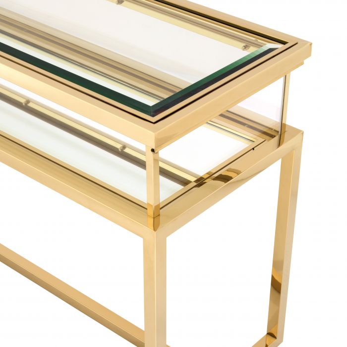 Display your collectables in style with the Harvey Console Table, the perfect console to showcase decorative items. Comprising a stainless steel frame with gold finish, it features a sliding display top of clear tempered glass and a bottom of mirrored glass.