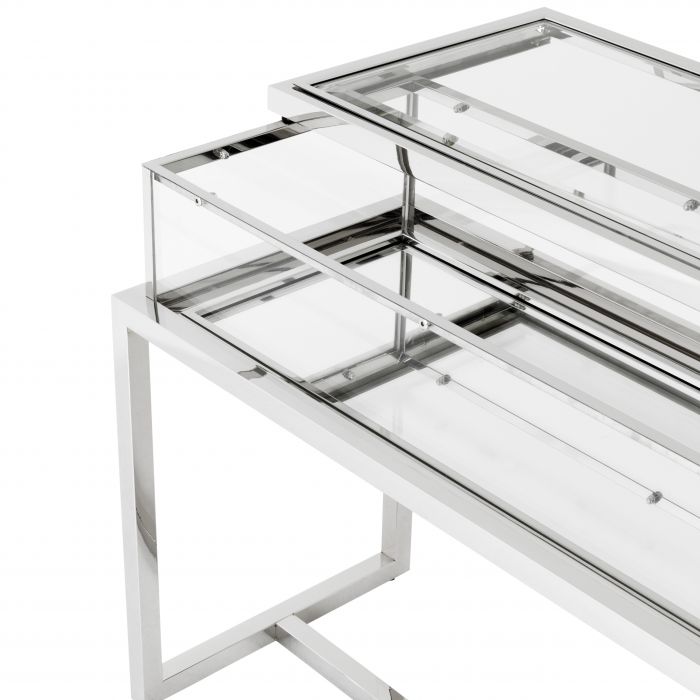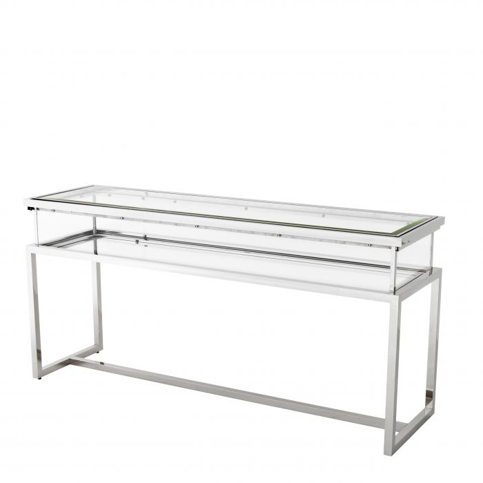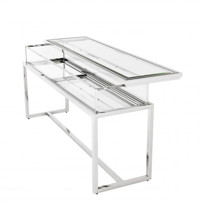 Display your collectables in style with the Harvey Console Table, the perfect console to showcase decorative items. Comprising a polished stainless steel frame, it features a sliding display top of clear tempered glass and a bottom of mirrored glass.