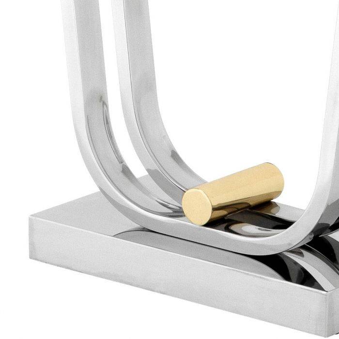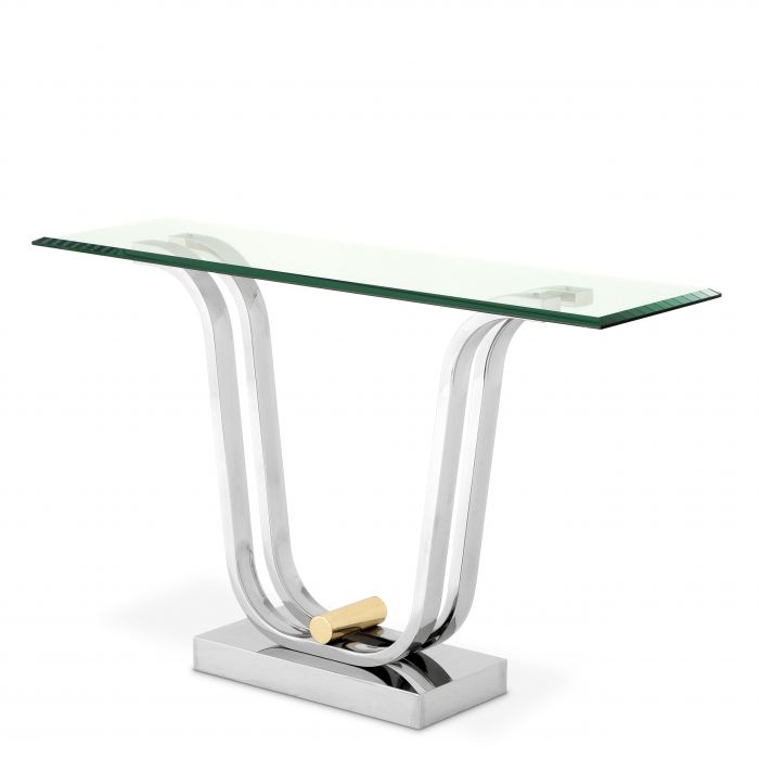 Comprising a curvaceous polished stainless steel base with a cylindrical gold finished central feature and a rectangular clear glass top with bevelled edges, the Julien Console Table is a dramatic feature pieces of furniture for any living space.