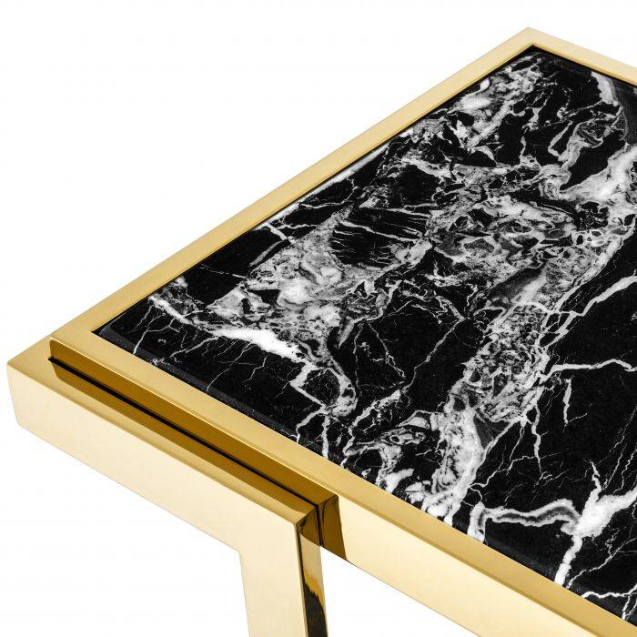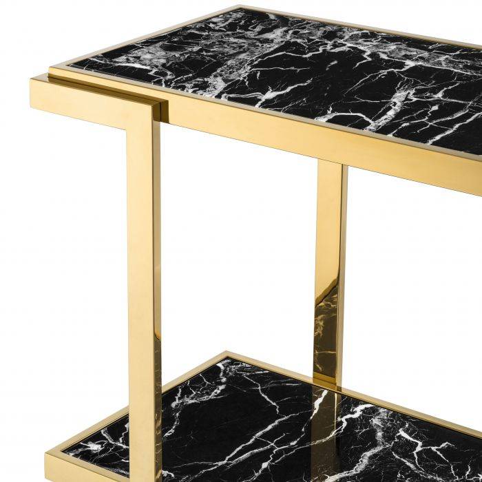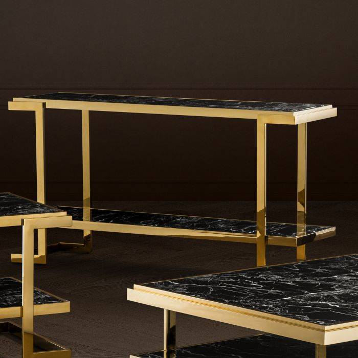 Find the key furniture piece you’ve been searching for with the Senato Console Table. Inspired by the eternal charm of natural marble, this gold finish console features a tabletop and lower shelf of faux black marble with white veins.