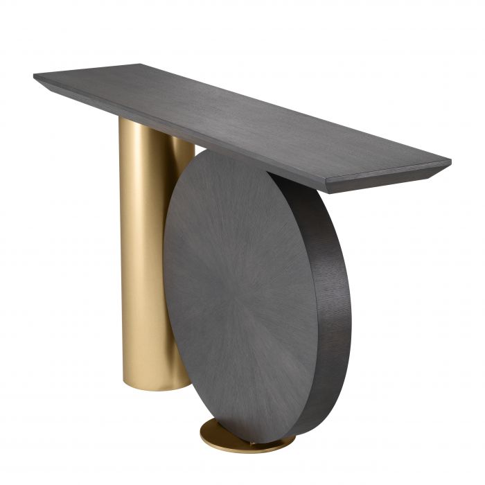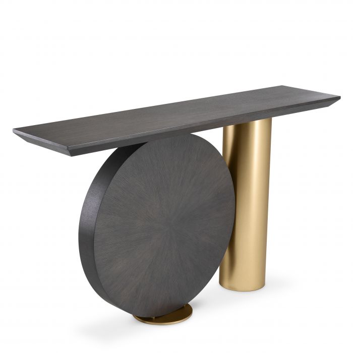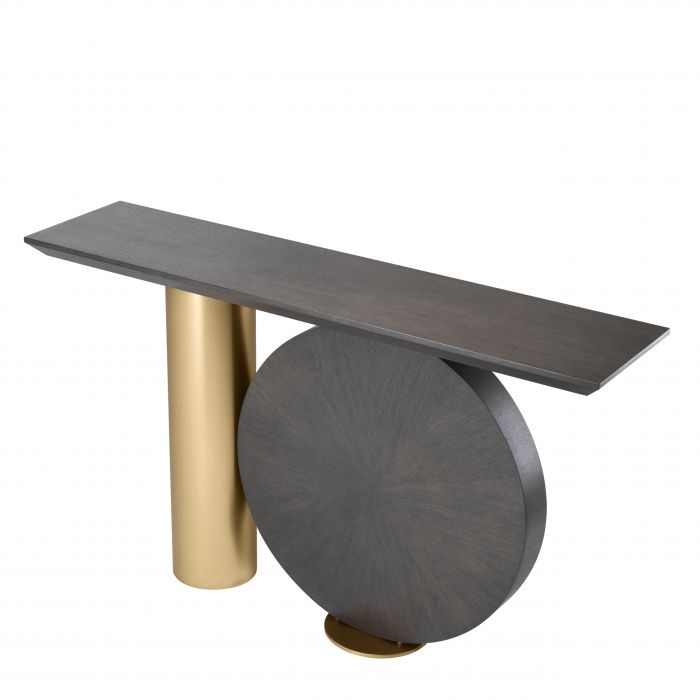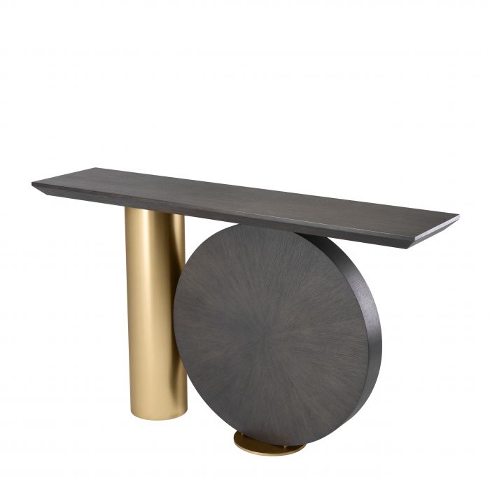 Let yourself be wooed by the Spring Console Table that is inspired by Postmodern design furniture. Its distinctive base is formed by a disk in mocha oak veneer and a brushed brass cylinder. Holding a rectangular table top of mocha oak veneer, this extravagant piece makes a glamorous showstopper in your entryway or living room.
