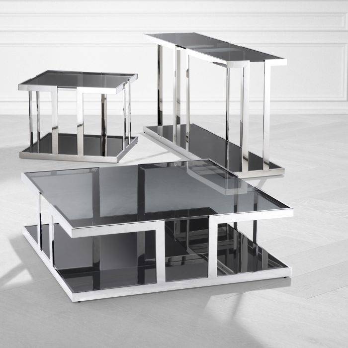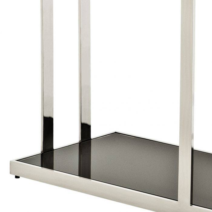 The elegant eye-catching Console Table Treasure features a sleek and shiny polished stainless steel frame which wraps around a black smoked glass tabletop and base.