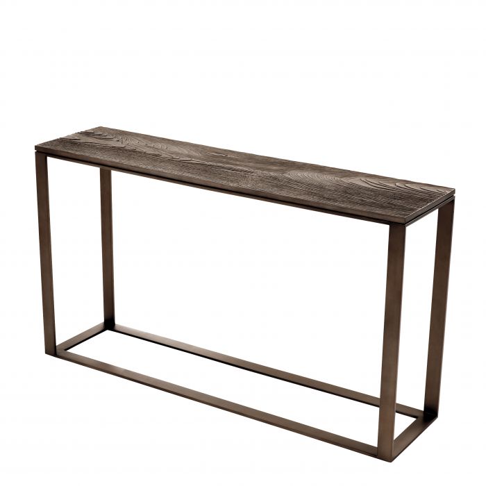 Anchor any living space in effortless style with the stunning Zino Console Table, featuring a tabletop with wood grain relief and a geometric base with light bronze finish. Restrained yet brimming with style, this attractive console is characterised by a sleek design that breaths a Mid-Century Modern aesthetic.