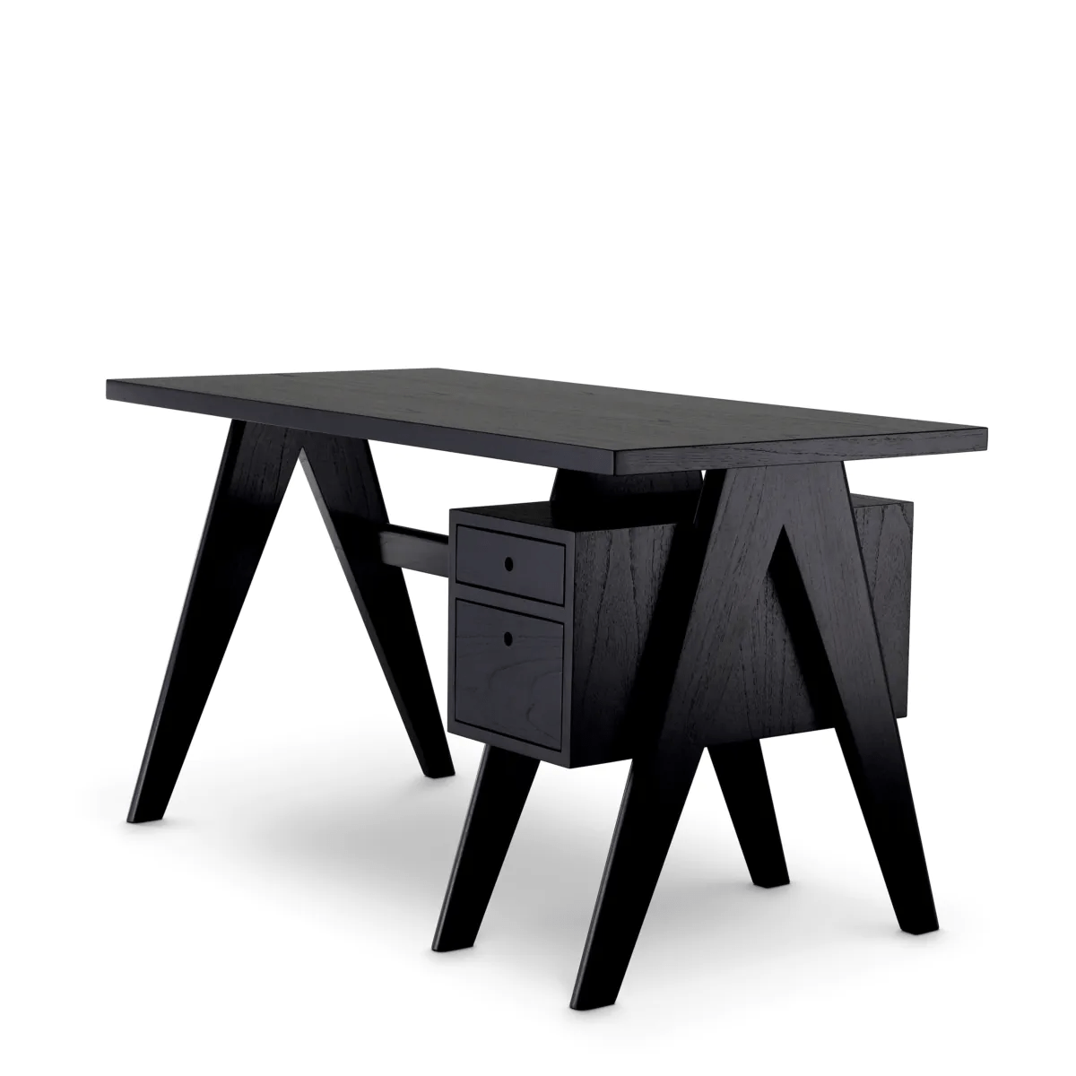 Made of solid wood, this restrained writing table is provided with a classic black finish. With an open shelf and a cupboard with two drawers, it offers ample storage space for your laptop, documents, writing supplies and charging cables.