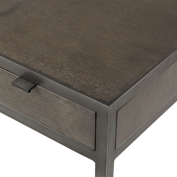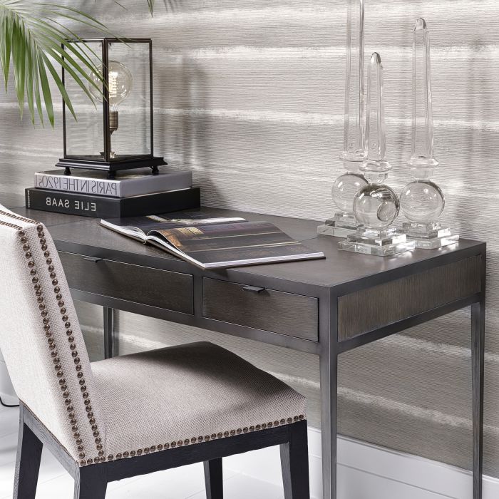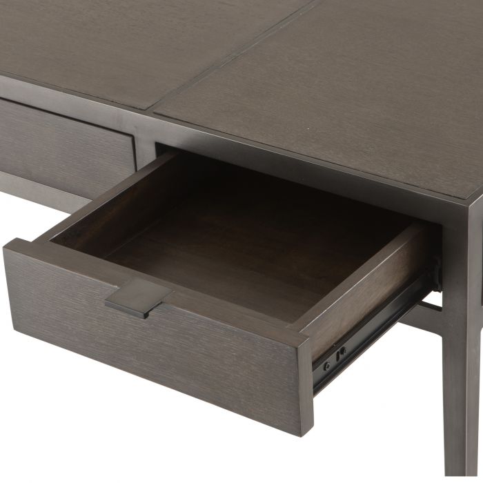 Bring industrial style to your home office, bedroom or hallway with the oak veneer Scavullo Desk, showcasing 3 storage drawers and a charcoal finish. This sleek writing desk is sure to create a wonderful accent among your urban modern décor.